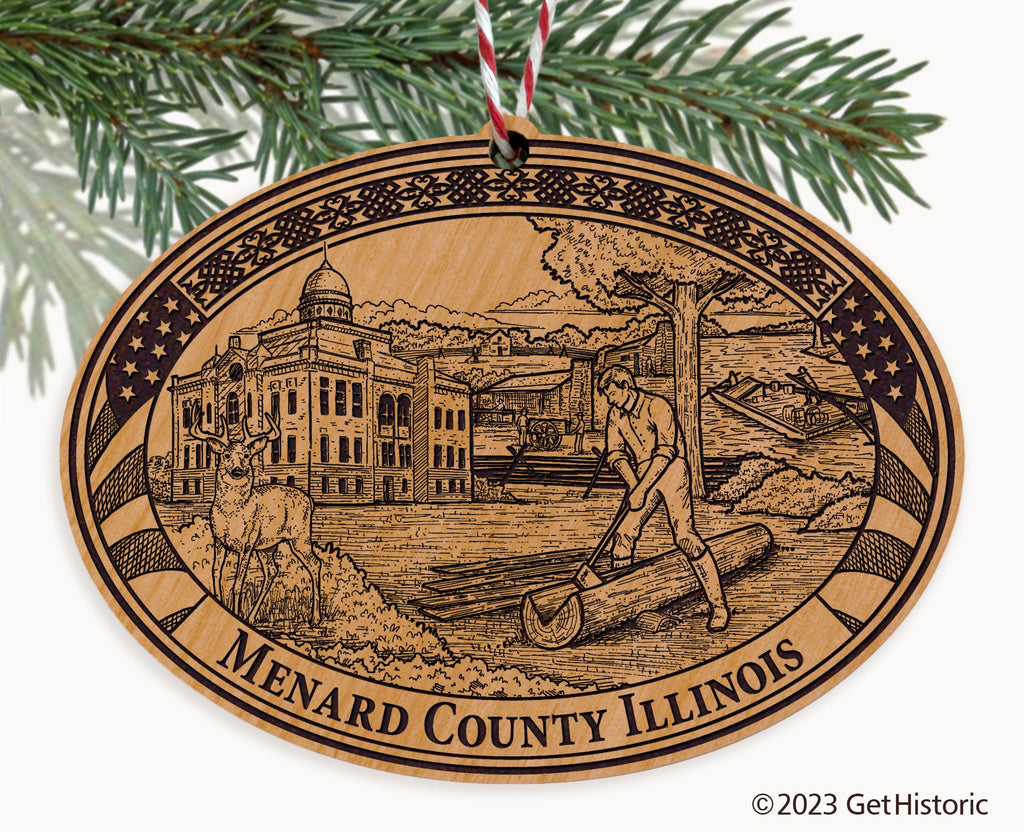 Celebrate the history of Menard County Illinois with our exclusive Natural Wood Engraved Ornament. One side will feature unique artwork telling the story of your county's history. The other side features a FREE personalization to create a cherished keepsake. If you choose not to personalize, our Get Historic logo and scrollwork will be engraved.