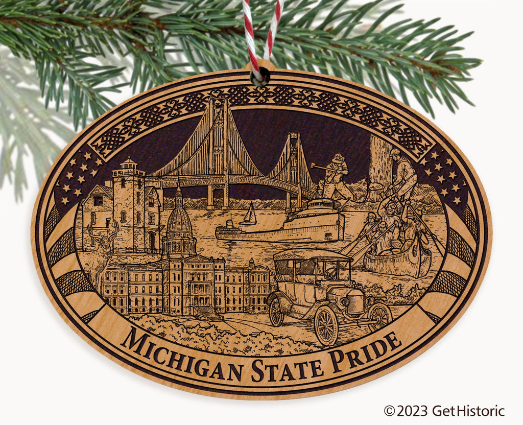Celebrate the history of Michigan with our exclusive Natural Wood Engraved Ornament. One side will feature unique artwork telling the story of your county's history. The other side features a FREE personalization to create a cherished keepsake. If you choose not to personalize, our Get Historic logo and scrollwork will be engraved.