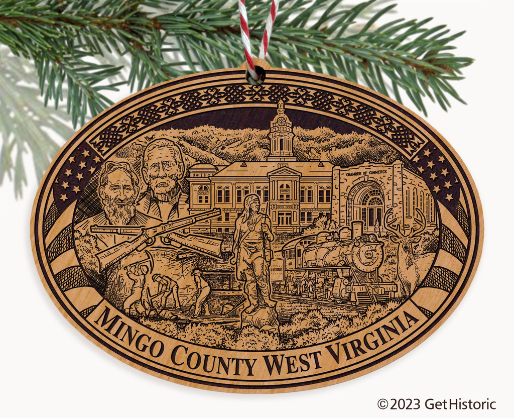 Celebrate the history of Mingo County with our exclusive Natural Wood Engraved Ornament. One side will feature unique artwork telling the story of your county's history. The other side features a FREE personalization to create a cherished keepsake. If you choose not to personalize, our Get Historic logo and scrollwork will be engraved.