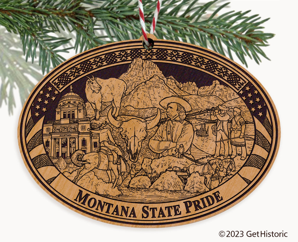 Celebrate the history of Montana with our exclusive Natural Wood Engraved Ornament. One side will feature unique artwork telling the story of your county's history. The other side features a FREE personalization to create a cherished keepsake. If you choose not to personalize, our Get Historic logo and scrollwork will be engraved.