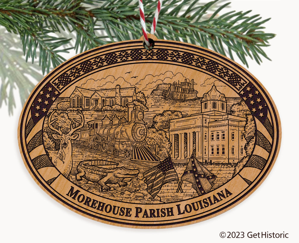 Celebrate the history of Morehouse Parish with our exclusive Natural Wood Engraved Ornament. One side will feature unique artwork telling the story of your parish's history. The other side features a FREE personalization to create a cherished keepsake. If you choose not to personalize, our Get Historic logo and scrollwork will be engraved.