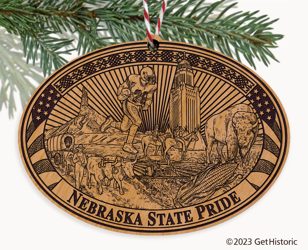 Celebrate the history of Nebraska with our exclusive Natural Wood Engraved Ornament. One side will feature unique artwork telling the story of your county's history. The other side features a FREE personalization to create a cherished keepsake. If you choose not to personalize, our Get Historic logo and scrollwork will be engraved.