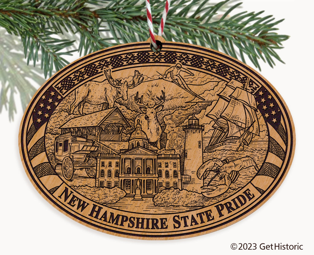 Celebrate the history of New Hampshire with our exclusive Natural Wood Engraved Ornament. One side will feature unique artwork telling the story of your county's history. The other side features a FREE personalization to create a cherished keepsake. If you choose not to personalize, our Get Historic logo and scrollwork will be engraved.