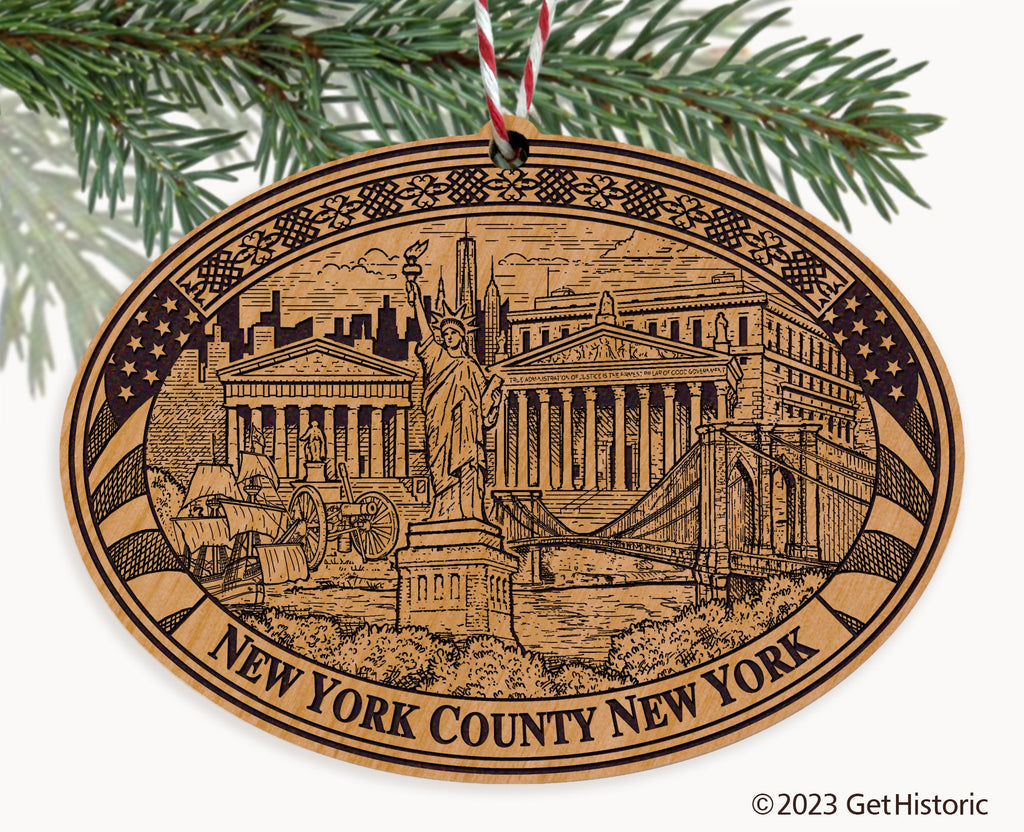 Celebrate the history of New York County with our exclusive Natural Wood Engraved Ornament. One side will feature unique artwork telling the story of your county's history. The other side features a FREE personalization to create a cherished keepsake. If you choose not to personalize, our Get Historic logo and scrollwork will be engraved.