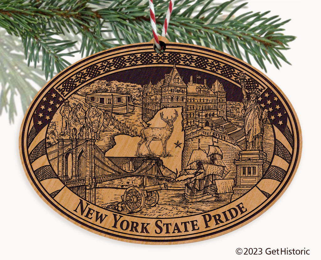 Celebrate the history of New York with our exclusive Natural Wood Engraved Ornament. One side will feature unique artwork telling the story of your county's history. The other side features a FREE personalization to create a cherished keepsake. If you choose not to personalize, our Get Historic logo and scrollwork will be engraved.
