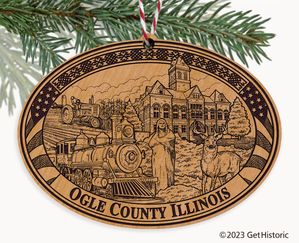 Celebrate the history of Ogle County Illinois with our exclusive Natural Wood Engraved Ornament. One side will feature unique artwork telling the story of your county's history. The other side features a FREE personalization to create a cherished keepsake. If you choose not to personalize, our Get Historic logo and scrollwork will be engraved.