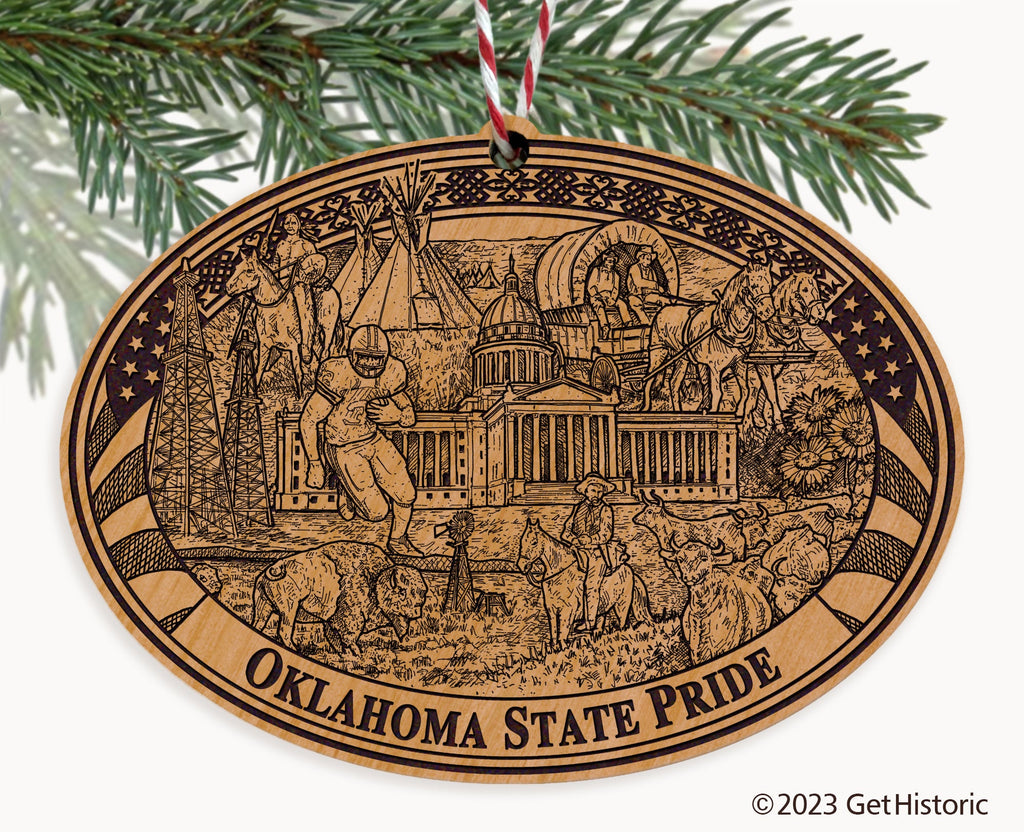Celebrate the history of Oklahoma with our exclusive Natural Wood Engraved Ornament. One side will feature unique artwork telling the story of your county's history. The other side features a FREE personalization to create a cherished keepsake. If you choose not to personalize, our Get Historic logo and scrollwork will be engraved.