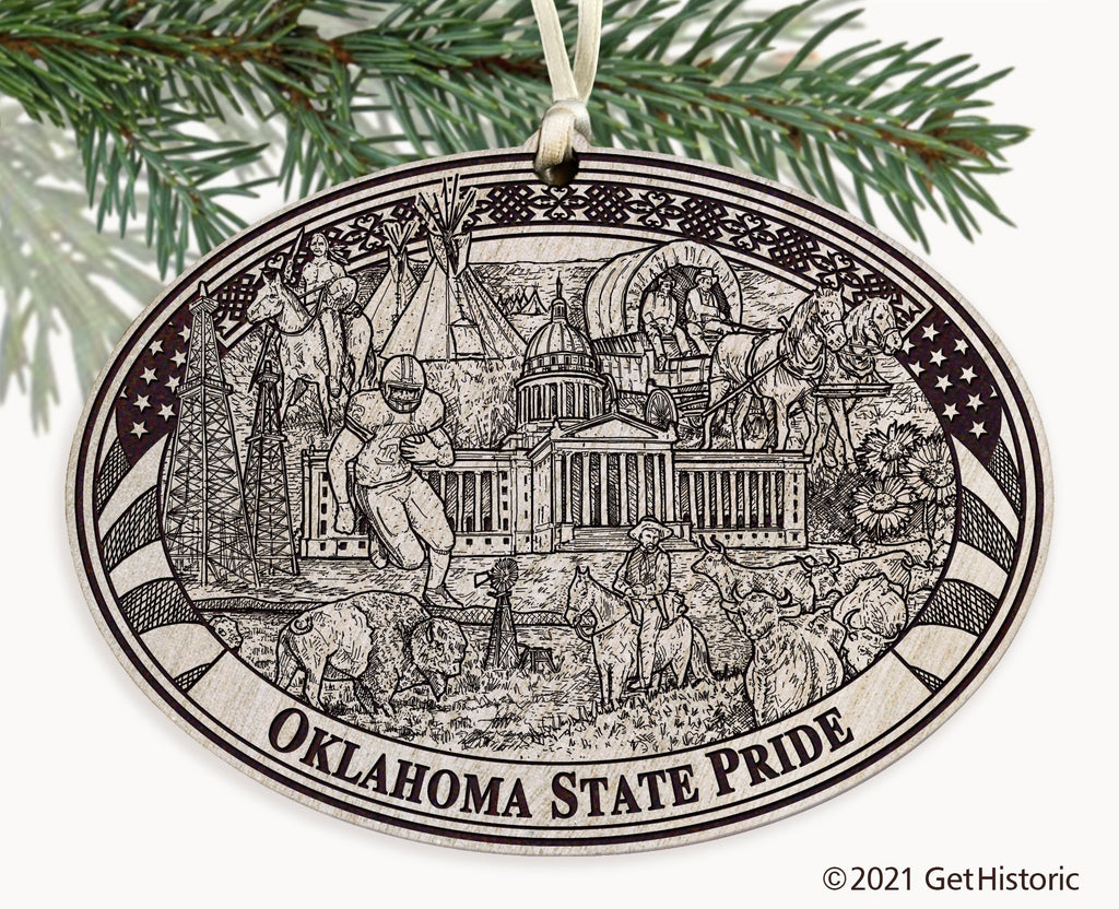 Celebrate the history of Oklahoma with our exclusive Personalized Wood Engraved Ornament. One side will feature unique artwork telling the story of your state's history. The other side will be personalized with your own wording to create a cherished keepsake. If you choose not to personalize, our Get Historic logo and scrollwork will be engraved.