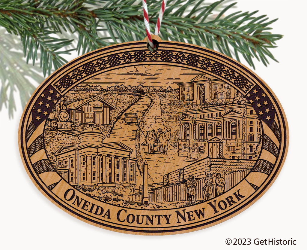Celebrate the history of Oneida County with our exclusive Natural Wood Engraved Ornament. One side will feature unique artwork telling the story of your county's history. The other side features a FREE personalization to create a cherished keepsake. If you choose not to personalize, our Get Historic logo and scrollwork will be engraved.