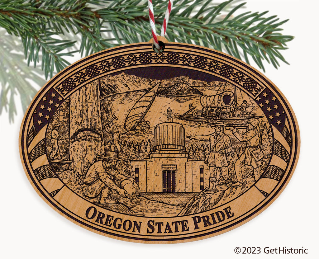 Celebrate the history of Oregon with our exclusive Natural Wood Engraved Ornament. One side will feature unique artwork telling the story of your county's history. The other side features a FREE personalization to create a cherished keepsake. If you choose not to personalize, our Get Historic logo and scrollwork will be engraved.