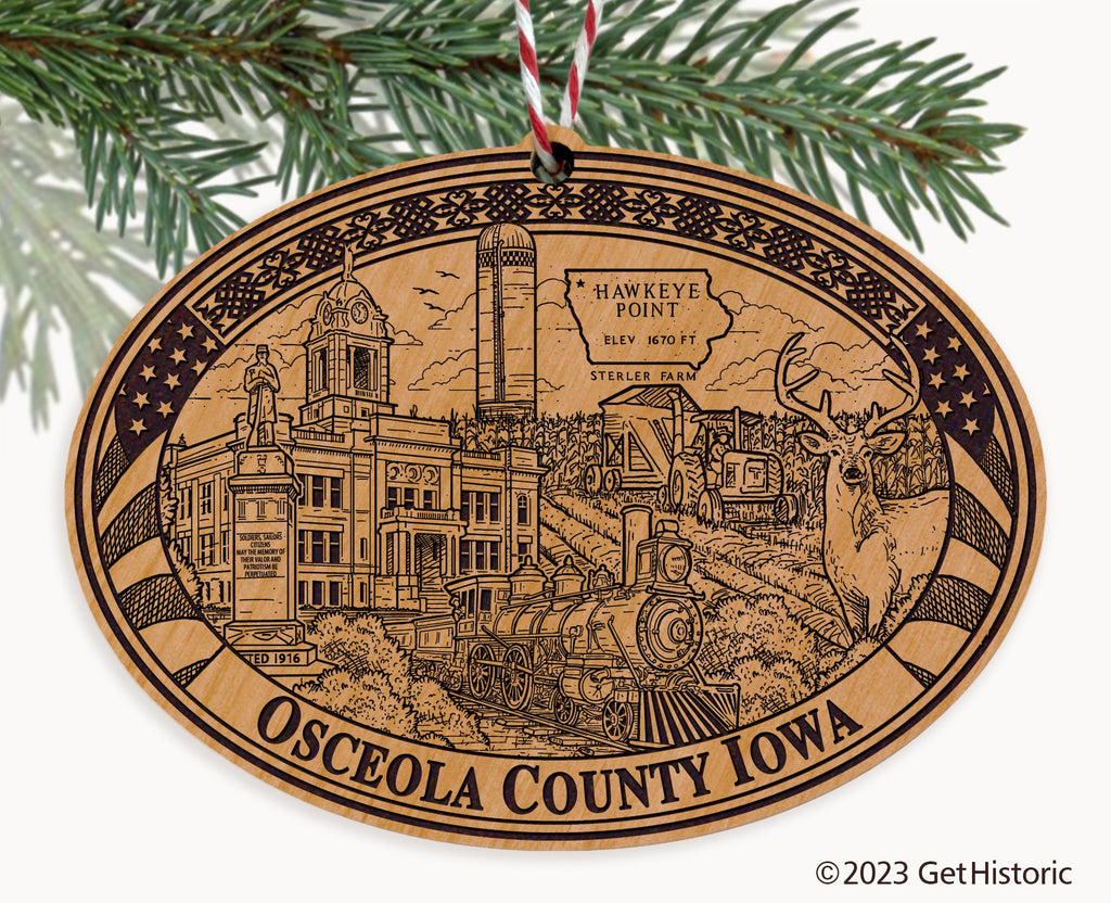 Celebrate the history of Osceola County with our exclusive Natural Wood Engraved Ornament. One side will feature unique artwork telling the story of your county's history. The other side features a FREE personalization to create a cherished keepsake. If you choose not to personalize, our Get Historic logo and scrollwork will be engraved.