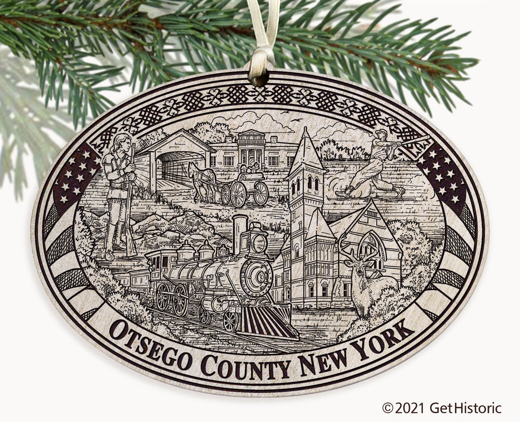 Celebrate the history of Otsego County with our exclusive Personalized Wood Engraved Ornament. One side will feature unique artwork telling the story of your county's history. The other side will be personalized with your own wording to create a cherished keepsake. If you choose not to personalize, our Get Historic logo and scrollwork will be engraved.