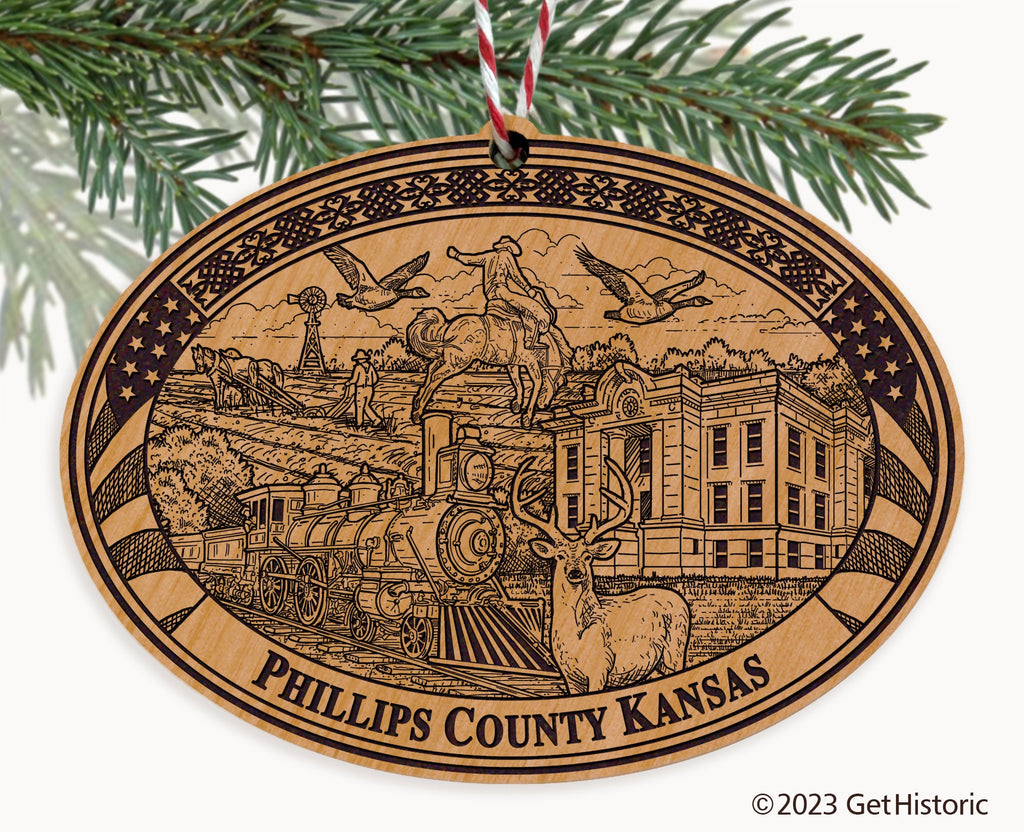 Celebrate the history of Phillips County with our exclusive Natural Wood Engraved Ornament. One side will feature unique artwork telling the story of your county's history. The other side features a FREE personalization to create a cherished keepsake. If you choose not to personalize, our Get Historic logo and scrollwork will be engraved.