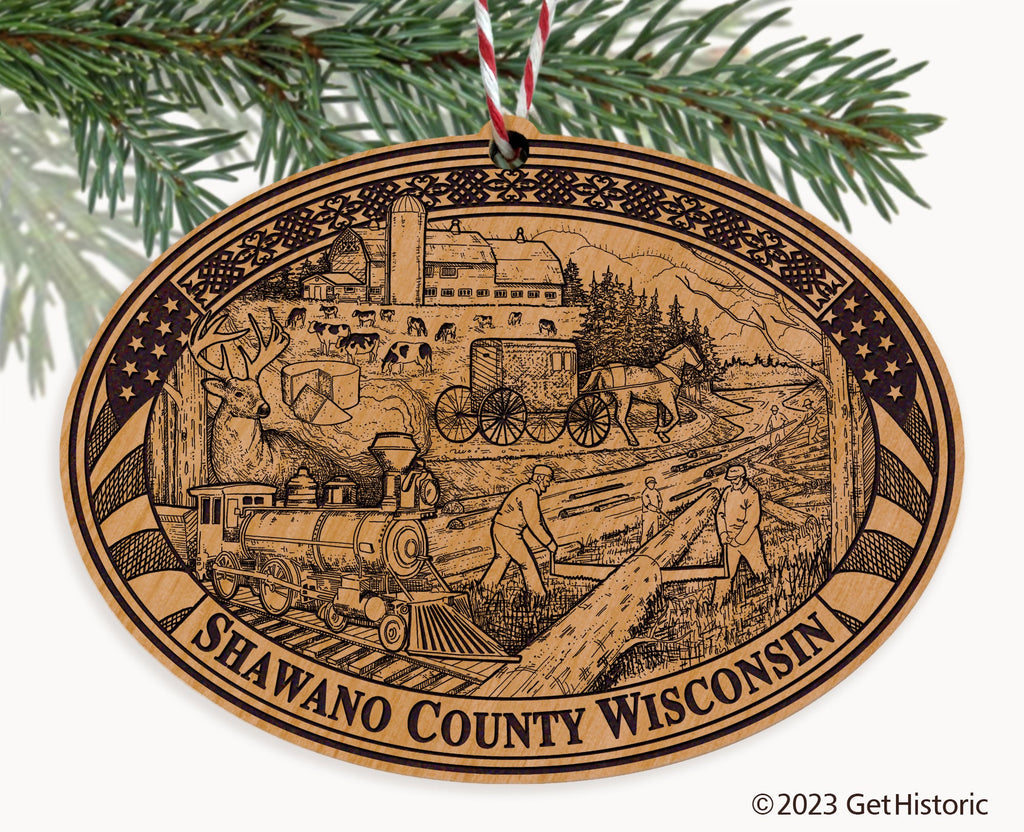 Celebrate the history of Shawano County with our exclusive Natural Wood Engraved Ornament. One side will feature unique artwork telling the story of your county's history. The other side features a FREE personalization to create a cherished keepsake. If you choose not to personalize, our Get Historic logo and scrollwork will be engraved.