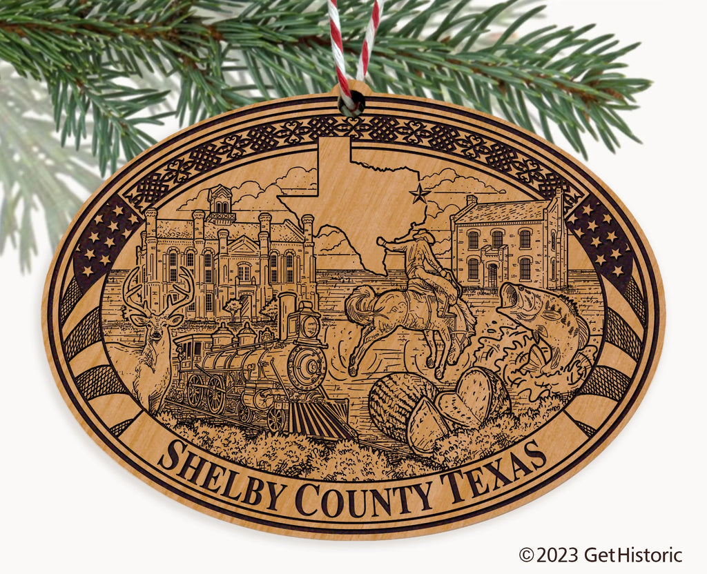 Celebrate the history of Shelby County Texas with our exclusive Natural Wood Engraved Ornament. One side will feature unique artwork telling the story of your county's history. The other side features a FREE personalization to create a cherished keepsake. If you choose not to personalize, our Get Historic logo and scrollwork will be engraved.