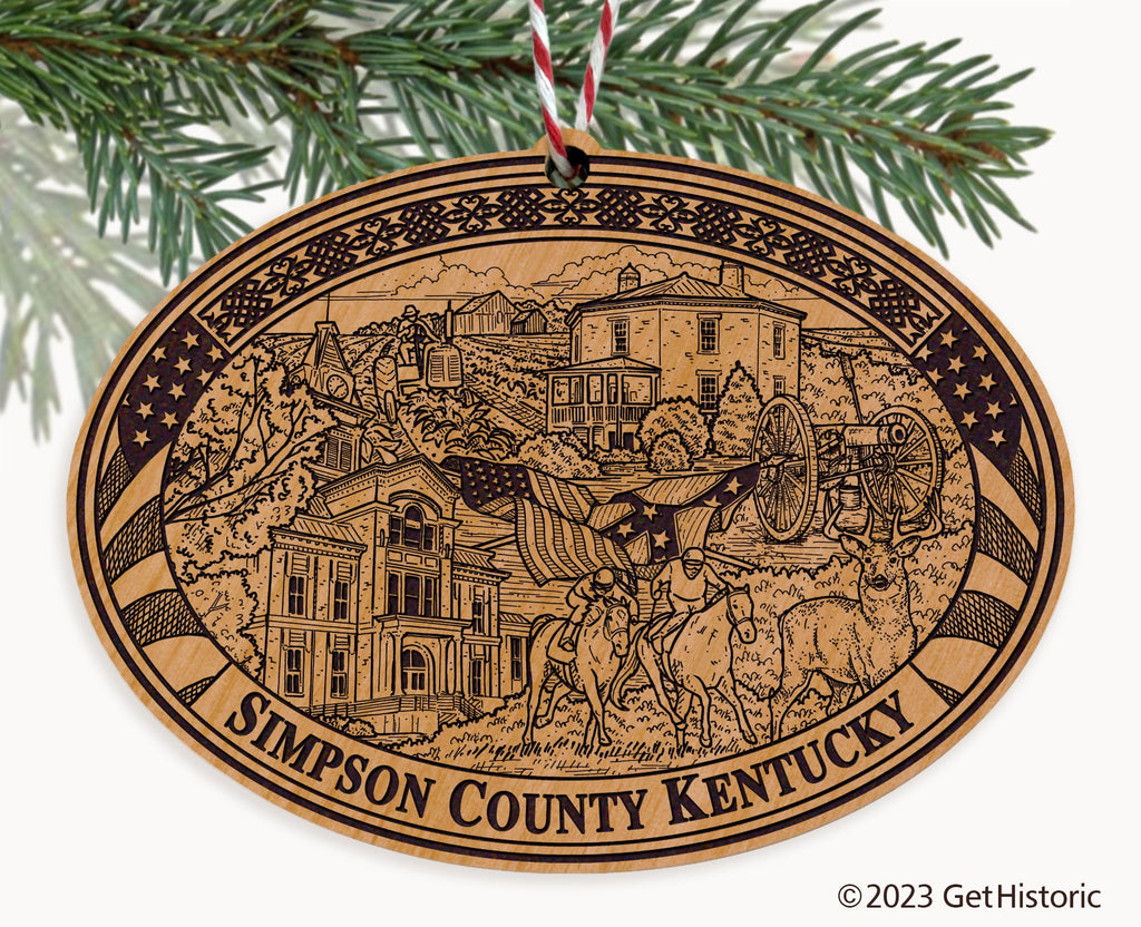 Celebrate the history of Simpson County with our exclusive Natural Wood Engraved Ornament. One side will feature unique artwork telling the story of your county's history. The other side features a FREE personalization to create a cherished keepsake. If you choose not to personalize, our Get Historic logo and scrollwork will be engraved.
