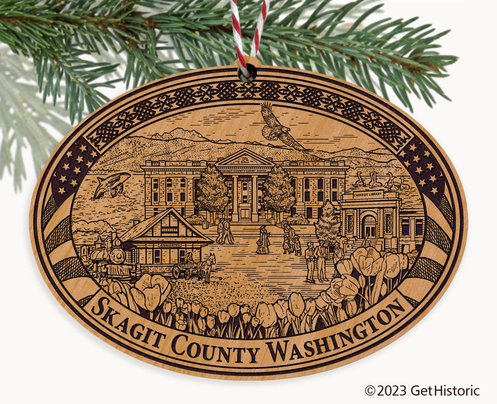Celebrate the history of Skagit County with our exclusive Natural Wood Engraved Ornament. One side will feature unique artwork telling the story of your county's history. The other side features a FREE personalization to create a cherished keepsake. If you choose not to personalize, our Get Historic logo and scrollwork will be engraved.