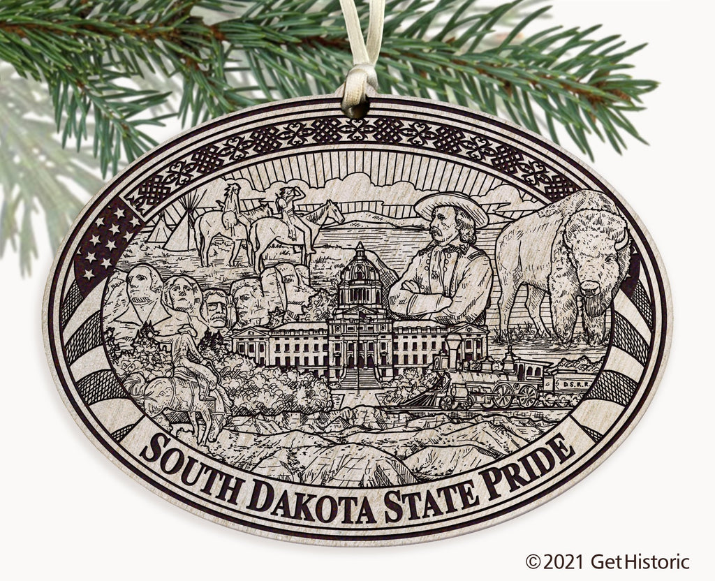 Celebrate the history of South Dakota with our exclusive Personalized Wood Engraved Ornament. One side will feature unique artwork telling the story of your state's history. The other side will be personalized with your own wording to create a cherished keepsake. If you choose not to personalize, our Get Historic logo and scrollwork will be engraved.