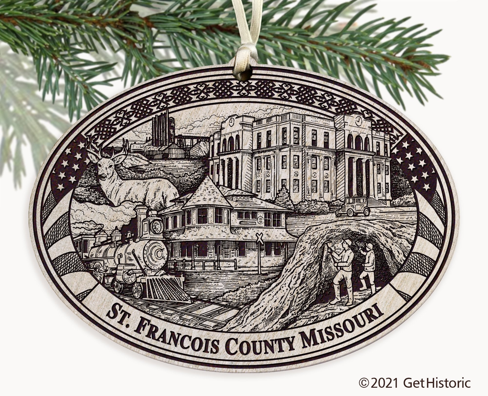 Celebrate the history of St. Francois County Missouri with our exclusive Personalized Wood Engraved Ornament. One side will feature unique artwork telling the story of your county's history. The other side will be personalized with your own wording to create a cherished keepsake. If you choose not to personalize, our Get Historic logo and scrollwork will be engraved.