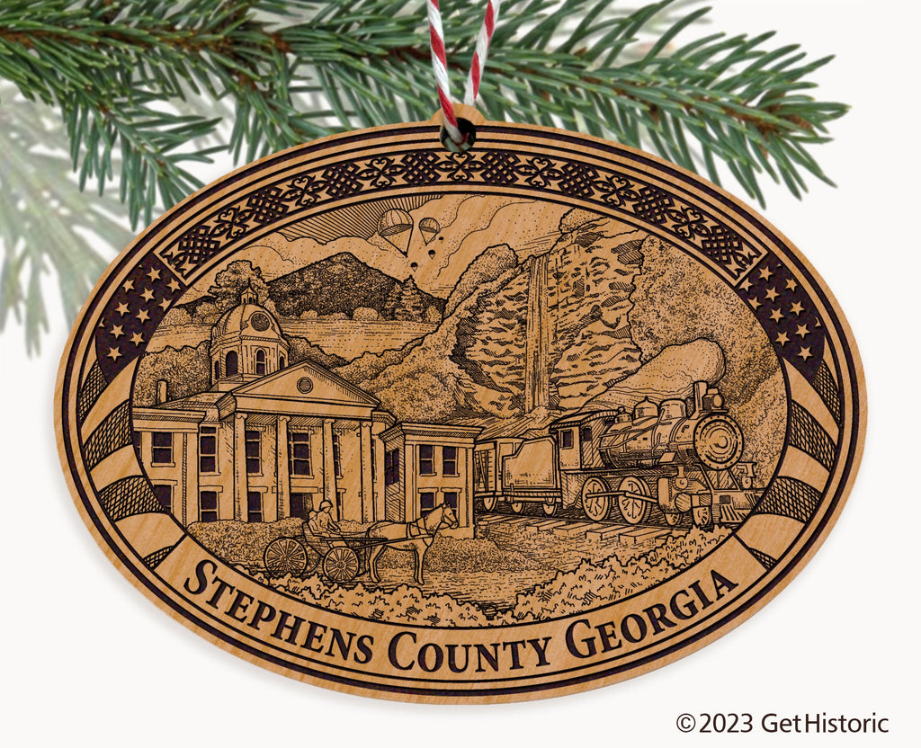Celebrate the history of Stephens County Georgia with our exclusive Natural Wood Engraved Ornament. One side will feature unique artwork telling the story of your county's history. The other side features a FREE personalization to create a cherished keepsake. If you choose not to personalize, our Get Historic logo and scrollwork will be engraved.