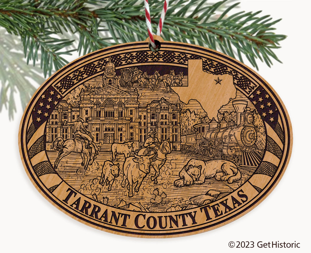 Celebrate the history of Tarrant County Texas with our exclusive Natural Wood Engraved Ornament. One side will feature unique artwork telling the story of your county's history. The other side features a FREE personalization to create a cherished keepsake. If you choose not to personalize, our Get Historic logo and scrollwork will be engraved.