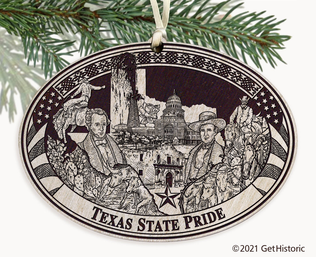 Celebrate the history of Texas with our exclusive Personalized Wood Engraved Ornament. One side will feature unique artwork telling the story of your state's history. The other side will be personalized with your own wording to create a cherished keepsake. If you choose not to personalize, our Get Historic logo and scrollwork will be engraved.