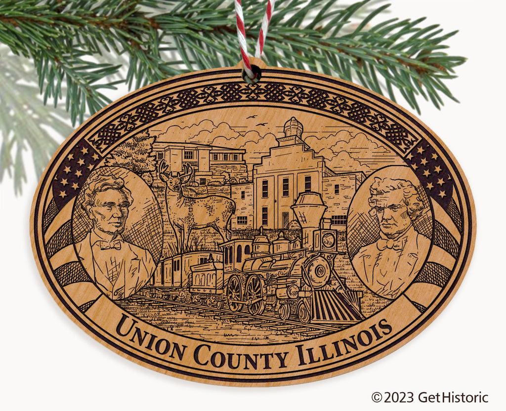 Celebrate the history of Union County Illinois with our exclusive Natural Wood Engraved Ornament. One side will feature unique artwork telling the story of your county's history. The other side features a FREE personalization to create a cherished keepsake. If you choose not to personalize, our Get Historic logo and scrollwork will be engraved.