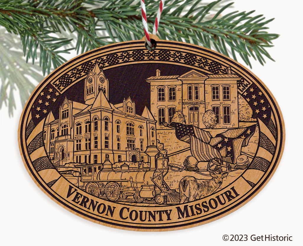 Celebrate the history of Vernon County Missouri with our exclusive Natural Wood Engraved Ornament. One side will feature unique artwork telling the story of your county's history. The other side features a FREE personalization to create a cherished keepsake. If you choose not to personalize, our Get Historic logo and scrollwork will be engraved.