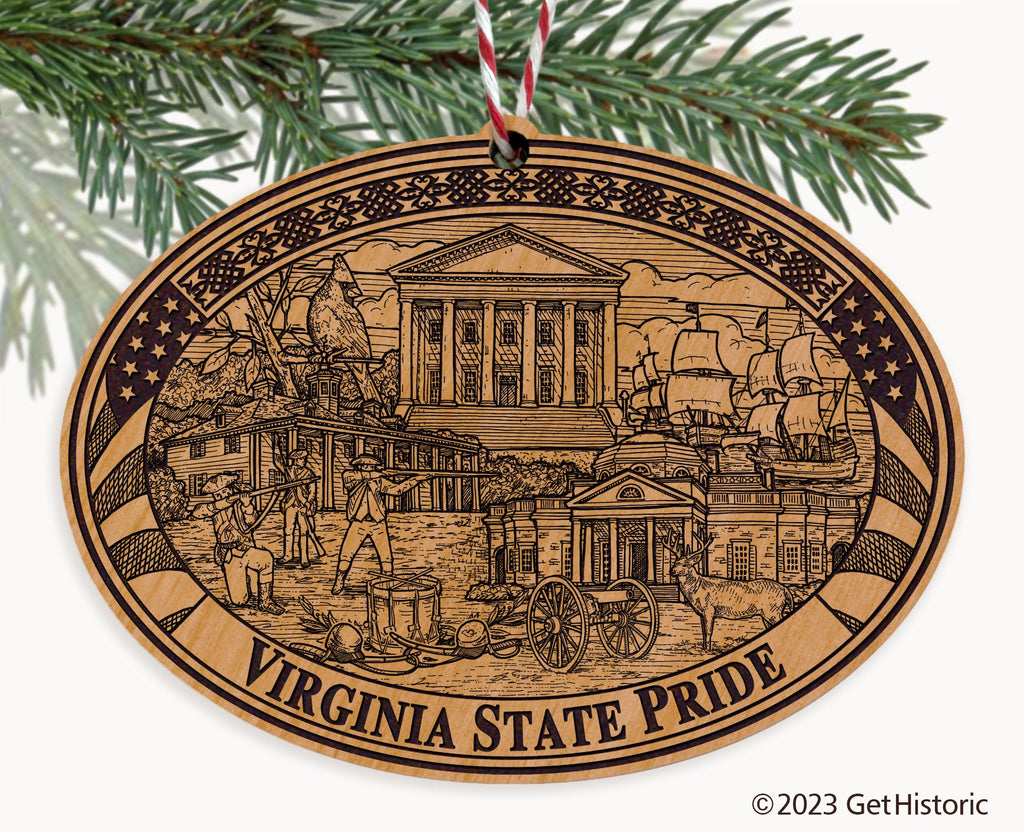 Celebrate the history of Virginia with our exclusive Natural Wood Engraved Ornament. One side will feature unique artwork telling the story of your county's history. The other side features a FREE personalization to create a cherished keepsake. If you choose not to personalize, our Get Historic logo and scrollwork will be engraved.
