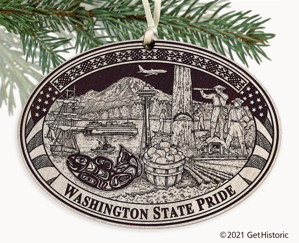 Celebrate the history of Washington with our exclusive Personalized Wood Engraved Ornament. One side will feature unique artwork telling the story of your state's history. The other side will be personalized with your own wording to create a cherished keepsake. If you choose not to personalize, our Get Historic logo and scrollwork will be engraved.