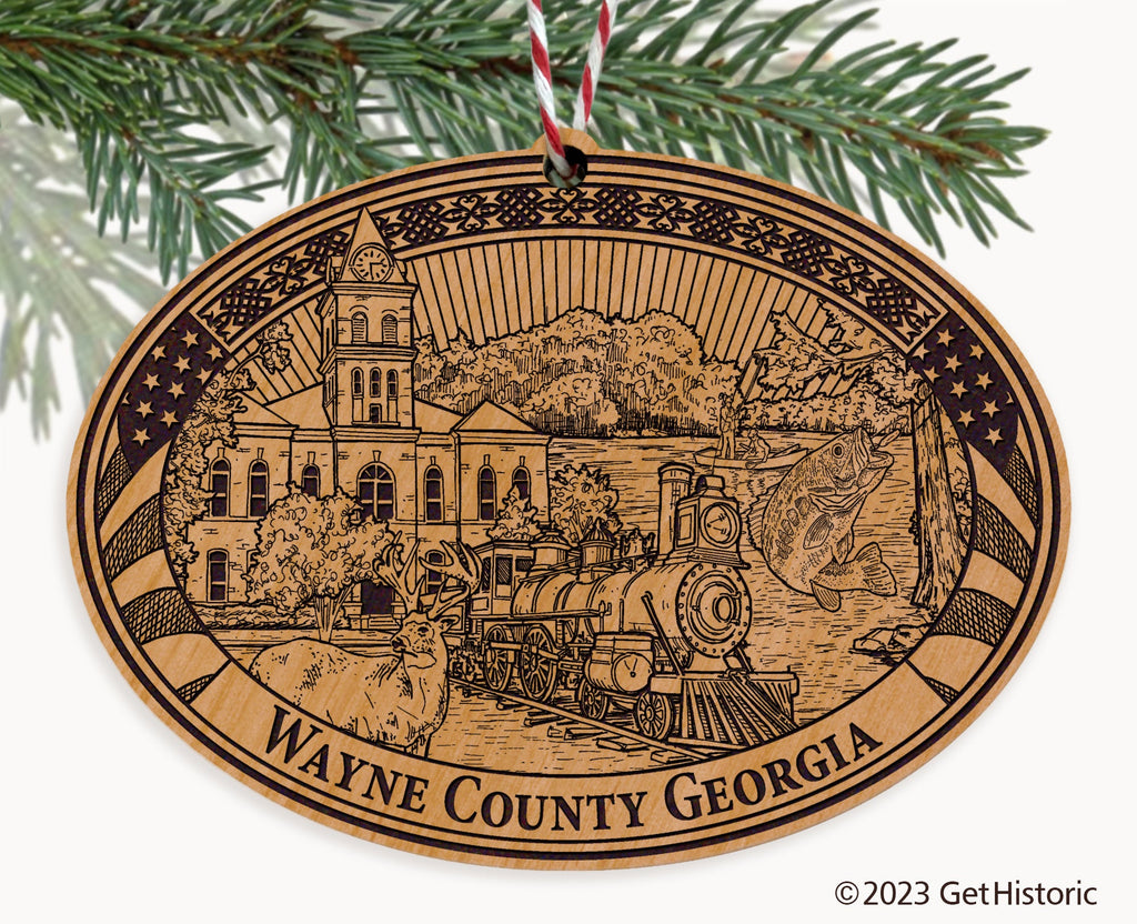 Celebrate the history of Wayne County Georgia with our exclusive Natural Wood Engraved Ornament. One side will feature unique artwork telling the story of your county's history. The other side features a FREE personalization to create a cherished keepsake. If you choose not to personalize, our Get Historic logo and scrollwork will be engraved.
