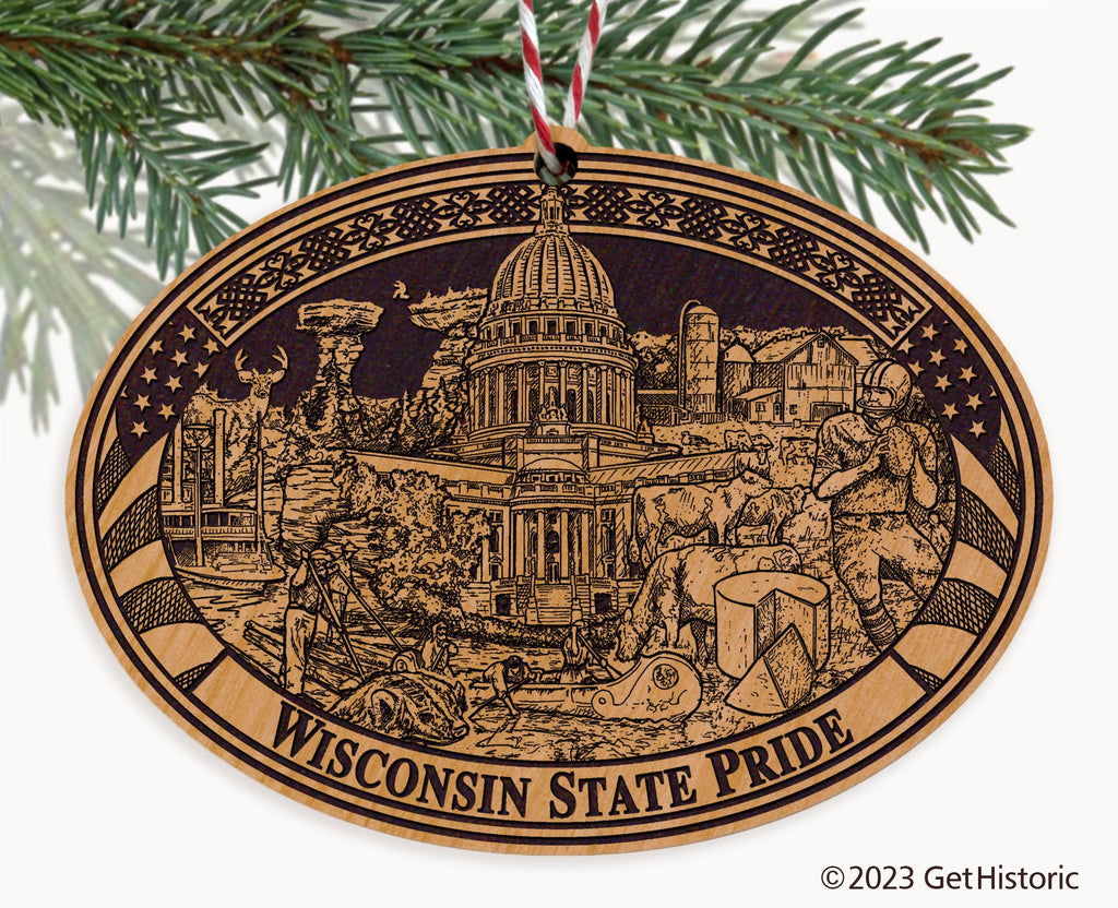 Celebrate the history of Wisconsin with our exclusive Natural Wood Engraved Ornament. One side will feature unique artwork telling the story of your county's history. The other side features a FREE personalization to create a cherished keepsake. If you choose not to personalize, our Get Historic logo and scrollwork will be engraved.