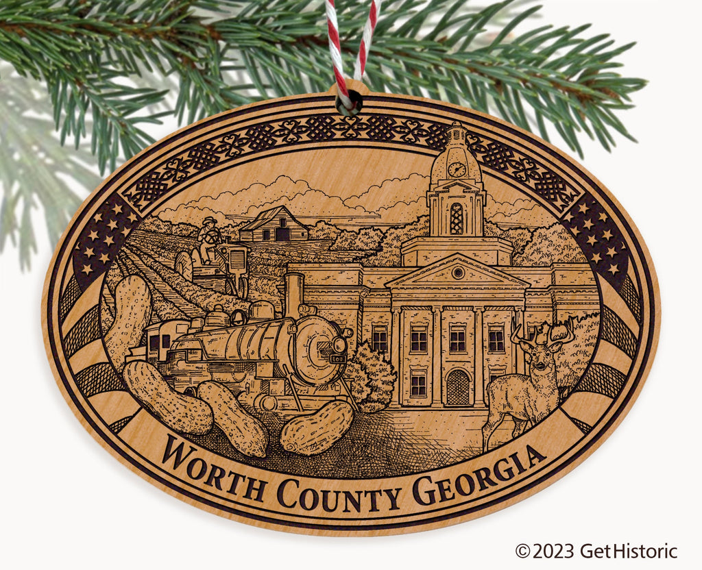 Celebrate the history of Worth County Georgia with our exclusive Natural Wood Engraved Ornament. One side will feature unique artwork telling the story of your county's history. The other side features a FREE personalization to create a cherished keepsake. If you choose not to personalize, our Get Historic logo and scrollwork will be engraved.