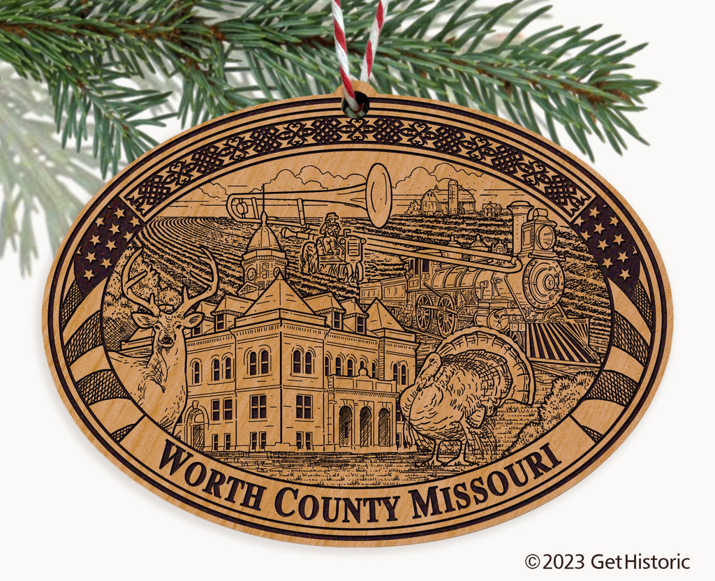 Celebrate the history of Worth County Missouri with our exclusive Natural Wood Engraved Ornament. One side will feature unique artwork telling the story of your county's history. The other side features a FREE personalization to create a cherished keepsake. If you choose not to personalize, our Get Historic logo and scrollwork will be engraved.