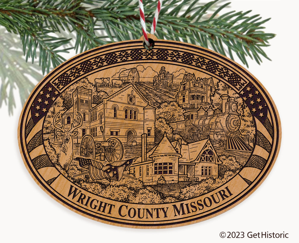 Celebrate the history of Wright County Missouri with our exclusive Natural Wood Engraved Ornament. One side will feature unique artwork telling the story of your county's history. The other side features a FREE personalization to create a cherished keepsake. If you choose not to personalize, our Get Historic logo and scrollwork will be engraved.