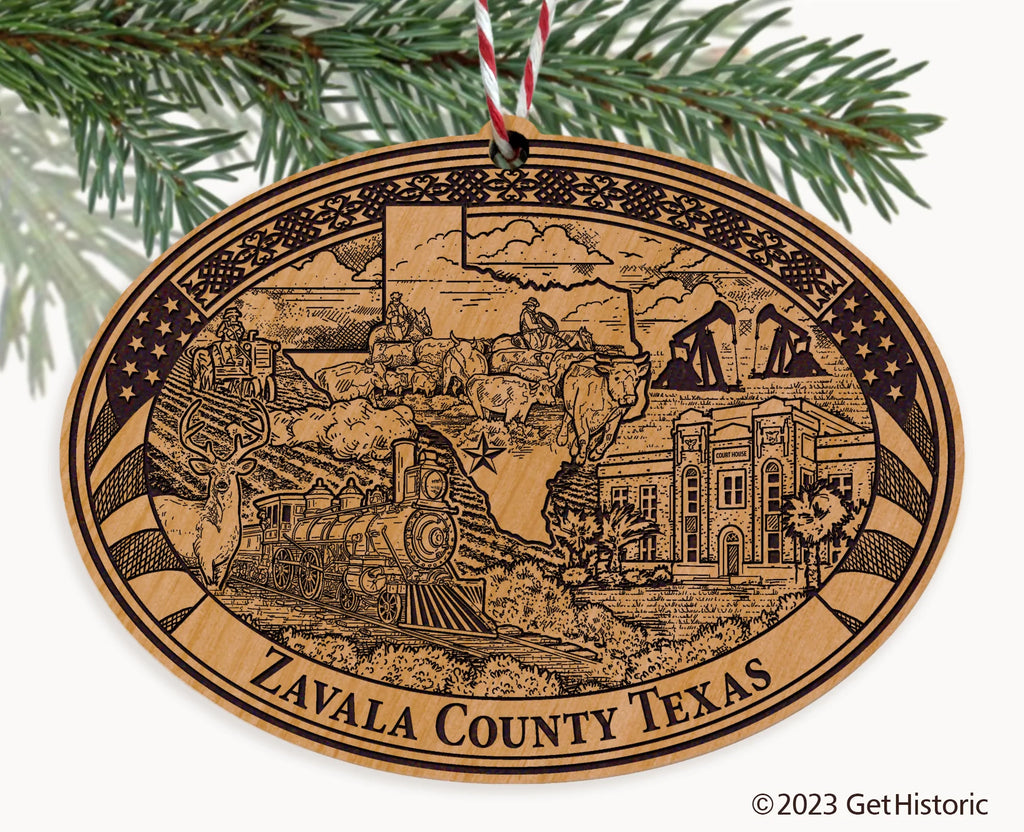 Celebrate the history of Zavala County Texas with our exclusive Natural Wood Engraved Ornament. One side will feature unique artwork telling the story of your county's history. The other side features a FREE personalization to create a cherished keepsake. If you choose not to personalize, our Get Historic logo and scrollwork will be engraved.